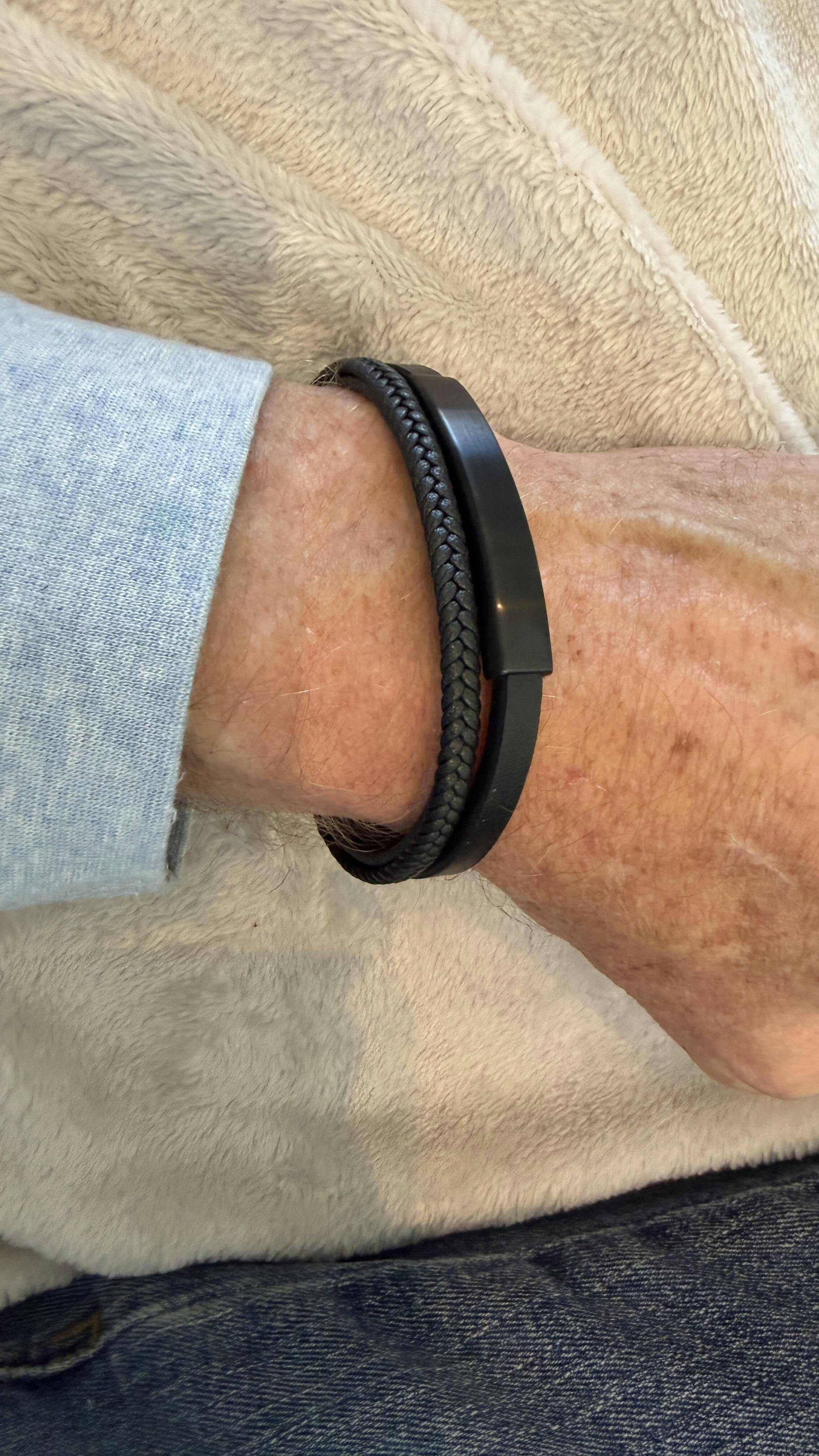 La pulsera de cremación de cuero de triple banda negra y ónix combina fuerza y estilo, ofreciendo una forma discreta de mantener cerca a un ser querido. Hecha con acero inoxidable y cuero negro duradero , su Tres correas distintas —lisas, trenzadas y con detalles metálicos— crean un diseño moderno. Un compartimento oculto alberga un Cantidad nominal de cenizas , asegurada mediante un cierre de rosca . La pulsera mide 8,5" de circunferencia y la placa de metal se puede personalizar con Grabado de color peltre , lo que lo convierte en un recuerdo verdaderamente significativo.