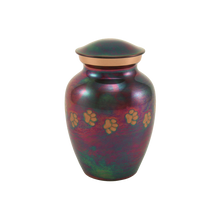 La urna de cremación mediana para mascotas con banda de huellas de pata clásica de Raku está fabricada en latón resistente con un radiante acabado raku en tonos iridiscentes de verde, rojo y dorado. Una banda de huellas de pata grabadas rodea la urna, simbolizando amor, alegría y recuerdos imborrables. Con una capacidad de 40 pulgadas cúbicas , esta urna contiene las cenizas de una mascota de hasta 40 libras. Cuenta con una tapa roscada segura . Se puede personalizar con grabado, lo que la convierte en un homenaje significativo y único.