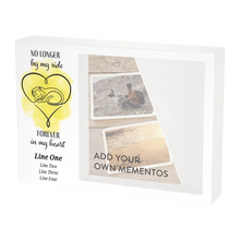 Un homenaje cálido y atemporal para tu querido gato. La urna de caja de sombras para cenizas y recuerdos de mascotas, con diseño de gato y corazón amarillo, representa la luz, la comodidad y el amor. Fabricada en resistente madera MDF , esta urna presenta un corazón de acuarela amarillo intenso que rodea la silueta de un gato dormido y la conmovedora frase "Ya no a mi lado, para siempre en mi corazón". El diseño de la caja de sombras te permite crear un emotivo recuerdo mostrando fotos, pequeños recuerdos y recuerdos preciados junto a las cenizas de tu mascota. Un panel trasero deslizante garantiza un acceso seguro, mientras que el grabado negro opcional personaliza esta pieza conmemorativa con el nombre y las fechas de tu gato.