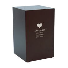 The Antique Bronze Steel Box Adult Cremation Urn offers a balance of durability, simplicity, and timeless beauty. Crafted from high-grade steel, it features a resilient antique bronze powder-coated finish that resists scratches and fading while maintaining a refined matte texture. Its clean, modern box shape complements both traditional and contemporary memorial spaces. With a 200 cubic inch capacity and a bottom-opening secured by four screws, this urn provides lasting protection for your loved one’s ashes. Optional white engraving is available, allowing families to add names, dates, or a heartfelt message that stands out elegantly against the bronze surface.