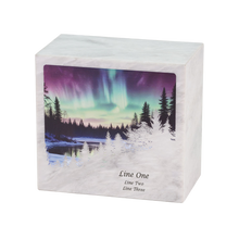 The Aurora Borealis Marble Adult Cremation Urn is crafted from natural white marble and features a vivid Aurora Borealis landscape panel that offers a serene and comforting tribute. With a 200 cubic inch capacity and a secure threaded bottom closure, it provides reliable placement for an adult’s ashes. Personalization is available in black engraving, allowing families to add meaningful details to honor their loved one. This urn blends artistic imagery with the enduring beauty of marble to create a lasting memorial.