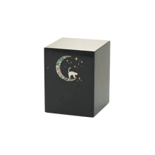 The Black Marble Cat & Moon Pink Inlay Large Pet Cremation Urn is a heartfelt tribute handcrafted from genuine black marble. Its polished surface is adorned with an intricate inlay of a cat gazing at a crescent moon accented in pink, with golden stars above — a design symbolizing eternal love, guidance, and remembrance. With a 75 cubic inch capacity, this urn provides a secure and dignified resting place for your beloved companion. A threaded bottom closure ensures ashes remain safely protected, while optional gold engraving allows for names, dates, or a short message. Each urn is one of a kind, featuring unique marble veining.