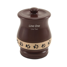 Brown Paw Print Band Large Pet Cremation Urn is a ceramic urn finished in a rich brown glaze and adorned with a tan paw print band symbolizing loyalty and companionship. It holds 70 cubic inches and seals securely with gel glue. Each urn includes a protective bag and tie for added care. Personalization is available with ivory engraving for a beautiful and lasting tribute.
