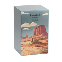 The Brushed Pewter Stainless Steel Desert Landscape Adult Cremation Urn reflects serenity, resilience, and natural beauty inspired by the open desert. Meticulously crafted from durable stainless steel, this urn features a sleek brushed pewter finish complemented by a warm desert landscape design that evokes peace and timeless grace. It includes a secure 4-screw bottom closure and a 200 cubic inch capacity, providing strength and lasting protection. This urn can be personalized with black engraving for a deeply meaningful tribute.