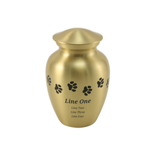 The Classic Brass Paw Print Band Pet Medium Cremation Urn is crafted from solid brass with a polished golden finish. Its engraved band of black paw prints symbolizes the loyalty and companionship of a beloved pet. With a capacity of 40 cubic inches, it is suitable for a pet weighing up to 40 lbs. A secure threaded lid provides peace of mind, while optional personalization creates a one-of-a-kind memorial.