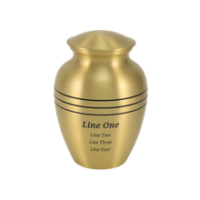 The Classic Bronze Three Band Large Cremation Urn is a traditional brass urn finished in brushed bronze with three black engraved bands around its body. It features a secure threaded lid closure to protect the ashes. With a capacity of 70 cubic inches, this urn is suitable for a portion of an adult’s remains or for a medium-sized loved one weighing up to 70 pounds. This piece may be personalized with engraving, creating a lasting memorial that combines durability with elegance.
