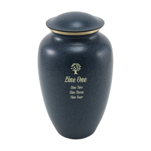 The Classic Granite Blue Gold Accent Ring Adult Cremation Urn is a full-size brass urn featuring a speckled blue and gray granite-style finish with a bronze accent ring beneath the lid. Its timeless appearance makes it a fitting memorial to display at home, in a columbarium, or at services. With a capacity of 195 cubic inches, this urn securely holds the ashes of an adult. The easy-close threaded lid, combines strength with dignified beauty.
