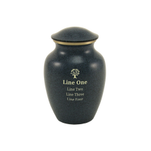 The Classic Granite Blue Gold Accent Ring Medium Cremation Urn is crafted from brass with a refined granite blue and gray finish highlighted by a polished gold accent ring. Its medium size offers a dignified way to honor a loved one, with a capacity of 40 cubic inches. Designed with a secure threaded lid, this urn provides both elegance and peace of mind. Personalized with engraving is to create a lasting tribute.