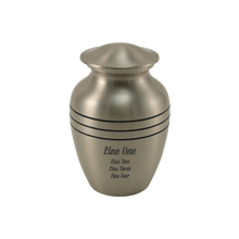 The Classic Pewter Three Band Medium Cremation Urn is crafted from brass with a dignified pewter finish accented by three engraved black bands. With a capacity of 40 cubic inches, this medium urn is designed for a smaller adult or for preserving a portion of ashes. A secure threaded lid ensures safe and lasting closure. This urn can also be personalized with engraving, creating a meaningful and lasting tribute.