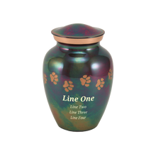 The Classic Raku Paw Print Band Pet Large Cremation Urn is crafted from durable brass with a luminous raku finish in iridescent shades of green, red, and gold. A band of engraved paw prints circles the urn, symbolizing companionship and loyalty. With a capacity of 85 cubic inches, this urn holds the ashes of a pet weighing up to 85 lbs. The urn features a secure threaded lid. Personalization with engraving is available, creating a meaningful and lasting tribute.