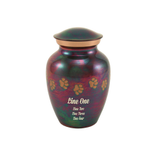 The Classic Raku Paw Print Band Pet Medium Cremation Urn is crafted from durable brass with a radiant raku finish of iridescent green, red, and gold tones. A band of engraved paw prints circles the urn, symbolizing love, joy, and lasting memories. With a capacity of 40 cubic inches, this urn holds the ashes of a pet weighing up to 40 lbs. It features a secure threaded lid. Personalization with engraving is available, making it a meaningful and unique tribute.