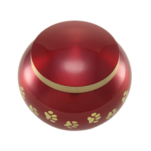 The Classic Round Crimson Paw Band Medium Pet Cremation Urn is crafted from solid brass with a deep crimson red finish and accented with a golden paw print band circling the body. Its rounded form reflects devotion, loyalty, and eternal companionship, while the threaded lid ensures secure closure. With a capacity of 40 cubic inches, this urn is suitable for pets weighing up to 40 lbs. Engraving options are available, allowing families to add names, dates, or special messages for a deeply personal memorial.