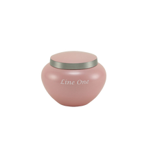 The Classic Round Pink Pewter Accents Extra Small Pet Cremation Urn is made from lightweight yet durable aluminum, finished with a soft pink enamel and accented by a refined pewter band on the lid. Its rounded silhouette provides a gentle, timeless design that blends naturally with home décor. With a capacity of 10 cubic inches, this urn is suitable for keepsake ashes or pets weighing up to 10 lbs. The secure threaded lid ensures safe closure, while optional personalization in muted pewter engraving allows families to add names, dates, or a heartfelt tribute.