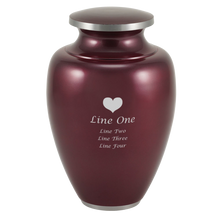 The Classic Vase Form Garnet Extra Large Cremation Urn is crafted from durable brass with a striking garnet red enamel finish accented by polished silver trim. Designed in a timeless vase silhouette, this extra large urn offers a generous 300 cubic inches of capacity, making it suitable for a larger adult or for combining remains. A secure threaded lid ensures safe closure, while the urn’s deep garnet tones symbolize love, honor, and enduring memory. Personalization with engraved names, dates, or sentiments is available.