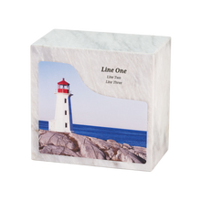 The Coastal Lighthouse White Marble Adult Cremation Urn is crafted from natural white marble with unique veining that makes each urn one of a kind. A vivid coastal lighthouse scene on the front symbolizes strength and guidance. This urn offers a 200 cubic inch capacity and secures with a threaded bottom closure for reliable protection. Black engraving personalization is available to create a meaningful and enduring tribute.