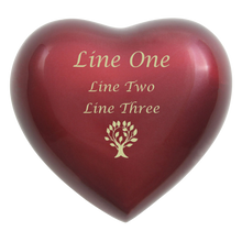 The Crimson Glossy Heart Small Pet Cremation Urn is crafted from strong brass with a vibrant crimson-red glossy finish. Its elegant heart shape symbolizes eternal love and devotion, making it a meaningful tribute. With a capacity of 20 cubic inches, it is suitable for a small pet up to 20 lbs. The threaded closure provides security. Optional engraving allows personalization with names, dates, or heartfelt messages.