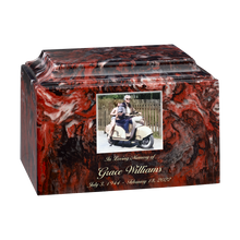 Cultured Marble Custom Color Photo Cremation Urn is a cremation urn crafted from Cultured Marble for a refined and lasting memorial display. With a 225 Cubic Inches capacity, it is designed to hold the ashes of a cherished loved one in a meaningful tribute. This urn features an innovative UV cured texture printing process that delivers a lifelike image with a raised printed surface, allowing families to touch and feel the image on their cherished memorial. Available colors include Blackstone, Greenfield, Redstone, Westminster, Blueridge, and Merlot. Personalization includes a Photo or Image and personalization on the front, with a maximum of 30 characters per line.