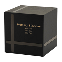 The Ebony and Gray Contemporary Extra Large Cremation Urn offers a modern tribute with clean lines and minimalist styling. Crafted from durable medium-density fiberboard (MDF), it features a sleek ebony body accented by subtle gray inlays for a refined, contemporary look. With a 245 cubic inch capacity, it accommodates the ashes of an adult weighing up to 245 pounds. A sliding bottom panel with screw ensures secure and lasting closure. Optional engraving reveals a light-to-dark brown tone, creating a personalized and lasting memorial.