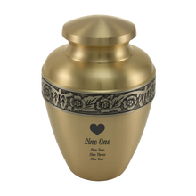 The Elysium Bronze Adult Cremation Urn is crafted from durable brass with a brushed bronze finish and a detailed floral engraving band that symbolizes beauty and remembrance. With a 200 cubic inch capacity, it provides a dignified resting place for an adult. The urn closes securely with a threaded lid, ensuring both safety and lasting tribute.
