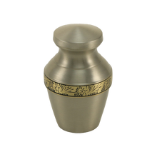 The Elysium Pewter Keepsake Urn is a beautifully crafted brass keepsake urn designed for sharing a small portion of a loved one’s ashes. Featuring a soft pewter finish accented with a finely etched floral brass band, this miniature urn symbolizes peace and remembrance. With a capacity of up to 5 cubic inches, it is ideal for families wishing to keep a small memorial close at heart. The threaded lid closure ensures security, while the urn can be further personalized with custom engraving in black.