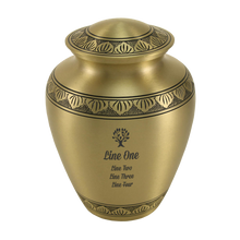 The Eternal Athena Bronze Adult Cremation Urn is an elegant memorial from the Elite Athena® Collection, crafted from durable brass with a warm bronze finish. It features a detailed engraved leaf-and-flower motif encircling the lid and body, symbolizing eternal life and remembrance. This full-size adult cremation urn holds up to 200 cubic inches of ashes and is secured with a threaded lid for lasting protection.