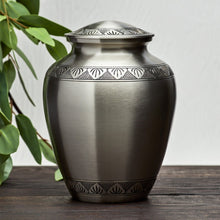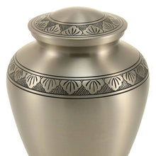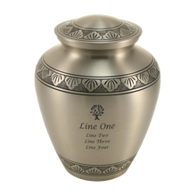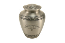 The Eternal Athena Pewter Adult Cremation Urn is a beautifully crafted memorial piece designed to honor your loved one with timeless dignity. Made from durable brass, it features a brushed pewter finish accented with delicate hand-engraved leaf bands that symbolize eternal life and remembrance. This adult cremation urn has a secure screw-top lid to ensure ashes are safely contained. With a capacity of 200 cubic inches, it is suitable for holding the ashes of an adult weighing up to 200 lbs before cremation.