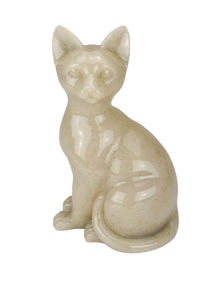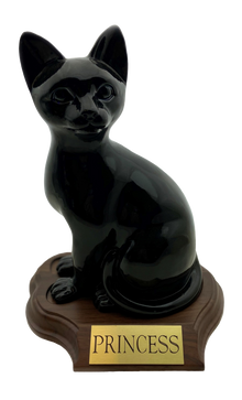 The Faithful Feline, Sitting Down Pet Cremation Urn is a beautifully sculpted memorial designed to honor your beloved cat with elegance and warmth. Made from a durable blend of granite stone particles and high-quality resin, this hollow figurine captures the calm posture of a sitting feline. It includes a custom contoured walnut display base with an engraved nameplate offering 4 lines of up to 25 characters each. A bottom threaded screw-plug allows secure access to the urn’s interior, which holds up to 30 cubic inches of ashes for pets up to 25 lbs.