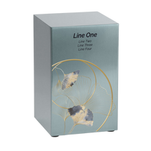 The Ginkgo Leaf Pewter Companion Urn – Left Side is a graceful memorial crafted from brushed stainless steel with a refined pewter finish. It features hand-painted ginkgo leaves in gold and blue tones, symbolizing resilience, harmony, and eternal life. This full-size adult cremation urn provides a 200 cubic inch capacity, secured with a bottom panel fastened by four screws. It can be displayed individually or paired with the Ginkgo Leaf Pewter Companion Urn - Right Side to form a complete companion urn set.