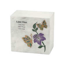 The Gold-Accented Butterfly White Marble Adult Cremation Urn is a handcrafted memorial made from natural white marble. Each urn is unique, with natural veining and variations that make it one of a kind. The design features a vibrant purple hibiscus flower alongside two gold butterflies inlaid with iridescent shell, symbols of transformation, love, and eternal peace. With a 200 cubic inch capacity, this full-size adult cremation urn is designed to hold the ashes of an adult. Personalization is available with elegant black engraving.