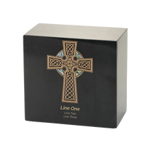 The Gold Celtic Cross Black Marble Adult Cremation Urn is a handcrafted memorial made from genuine black marble. Each urn is unique, with natural veining that ensures no two are exactly alike. The design features a bold gold Celtic Cross with shimmering blue shell inlays, symbolizing eternal faith, love, and remembrance. With a 200 cubic inch capacity, this full-size adult cremation urn is suitable for holding an adultâs ashes. It is secured with a threaded bottom closure. Personalization is available, with custom engraving offered in elegant gold.