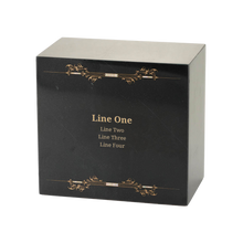 Gold Scroll Black Marble Adult Cremation Urn is crafted from genuine black marble with natural veining and an elegant gold scroll border accented with shell inlays. Symbolizing grace and remembrance, it offers 200 cubic inches of capacity in 8" H x 8.5" W x 5" D dimensions. A threaded bottom closure secures the contents. Personalization with gold engraving is available.