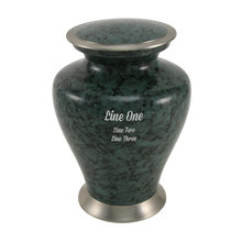 The Gray Marble Aluminum Adult Cremation Urn with Brass Accents combines elegance and strength in a timeless memorial design. Crafted from aluminum with brass, it features a gray marble finish that evokes calm dignity and enduring love. The brushed brass trim along the lid and base offers a touch of sophistication that enhances its classic form. Designed with a secure threaded lid, it holds up to 200 cubic inches of ashes. Optional personalization allows engraving in a silver color, making each urn uniquely meaningful.