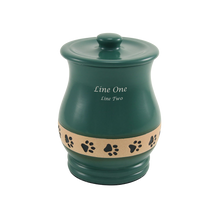 Green Paw Print Band Medium Pet Cremation Urn is a ceramic urn finished in a deep green glaze and accented with a tan paw print band symbolizing loyalty and remembrance. It holds 40 cubic inches, perfect for medium pets. The urn seals with gel glue. Personalization is available with ivory engraving color for a soft, elegant memorial finish.