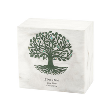 Green Tree of Life White Marble Adult Cremation Urn is a handcrafted memorial made from genuine white marble, accented with a vibrant green Tree of Life and subtle shell inlays. Symbolizing connection, growth, and eternal love, this urn provides a 200 cubic inch capacity in 8" H x 8.5" W x 5" D dimensions. It is secured with a threaded bottom closure. Personalization is available with black engraving for names, dates, or a short message.