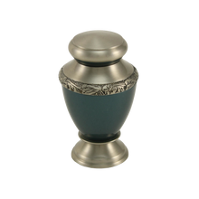 The Heirloom Indigo Keepsake Urn is crafted from durable aluminum with brass and finished with a delicate metallic indigo luster. Its design features a hand-engraved pewter band that highlights the urn’s elegant shape. This keepsake urn holds a small portion of ashes, with a capacity of up to 5 cubic inches, making it perfect for sharing among family or as a personal remembrance. The urn is secured with a threaded lid.