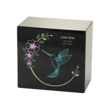 Hummingbird Teal Black Marble Adult Cremation Urn is crafted from genuine black marble with natural veining. A teal hummingbird and floral vine with shell inlays symbolize beauty and enduring love. It provides 200 cubic inches of capacity in 8" H x 5" D x 8.5" W dimensions and secures with a threaded bottom closure. Personalization is available for names, dates, or a short message.