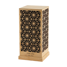 The Intricate Bamboo Design Extra Large Cremation Urn is carefully crafted from bamboo, a material known for its natural beauty, strength, and sustainability. Featuring an elegant geometric lattice pattern, this urn blends artistry with function, serving as both a memorial vessel and a decorative display piece. With a 250 cubic inch capacity, it is suitable for most adults. The sliding bottom panel secured by a screw ensures ashes are safely contained. Families may also add personalization in dark brown engraving, making each urn a one-of-a-kind tribute.