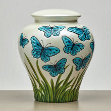 The Ivory Ceramic Blue Butterflies Adult Cremation Urn captures the beauty of transformation and peace through a gentle, nature-inspired design. Crafted from ceramic, it features a smooth ivory glaze adorned with hand-painted blue butterflies—a timeless symbol of hope and renewal. This urn offers a 235 cubic inch capacity and a threaded bottom closure for secure sealing. Its refined finish and serene motif create a graceful tribute for home or memorial display.