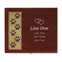 The Large Paw Print Memory Chest in Gloss Wood Finish is a beautifully handcrafted memorial that lets you honor your beloved pet while keeping their most cherished mementos close. Made from durable medium-density fiberboard (MDF) with a high-gloss wood finish, this chest features a band of brass paw prints symbolizing eternal companionship. Inside, a spacious compartment provides room for ashes, toys, photos, and keepsakes, while the hinged lid with bronze clasp keeps everything secure. Personalization is available with ivory engraving, allowing you to add a meaningful name or message for a lasting tribute.