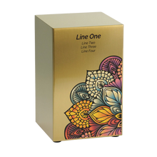 The Mandala Companion Urn – Left Side is crafted from durable brushed stainless steel with a warm bronze-plated finish. It features a vibrant mandala design symbolizing unity, eternity, and harmony. This full-size adult cremation urn holds up to 200 cubic inches of ashes and is secured with a bottom panel fastened by four screws. Designed to stand beautifully on its own, it can also be paired with the Mandala Companion Urn - Right Side urn for a companion tribute.