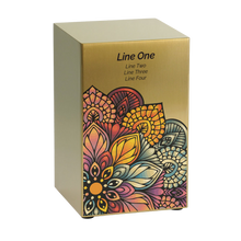The Mandala Companion Urn – Right Side is crafted from brushed stainless steel with a warm bronze-plated finish. Featuring vibrant mandala artwork, it symbolizes unity, eternity, and harmony. This full-size adult cremation urn holds up to 200 cubic inches of ashes and is secured with a bottom panel fastened by four screws. Designed to be displayed alone or paired with the Mandala Companion Urn - Left Side urn for a companion tribute.