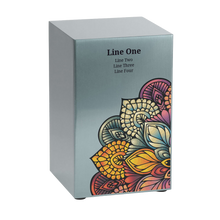 The Mandala Pewter Companion Urn – Left Side crafted from brushed stainless steel with a soft pewter finish. Featuring a vibrant mandala design, this urn symbolizes eternity, unity, and remembrance. This full-size adult cremation urn holds up to 200 cubic inches of ashes and is secured with a bottom panel fastened by four screws. It can be displayed individually or paired with the Mandala Pewter Companion Urn - Right Side to form a complete companion urn set.