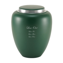 The Matte Emerald Aluminum Adult Cremation Urn features a deep emerald green finish with a subtle silver band accent on the lid. Expertly crafted from aluminum, it provides lasting durability while maintaining a soft, elegant appearance. With a capacity of 200 cubic inches, it safely holds the ashes of an adult. The threaded lid ensures secure closure, and personalization with silver engraving adds a meaningful touch to honor your loved one.