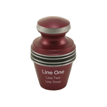 The Matte Magenta Aluminum Accent Band Keepsake Urn is a handcrafted memorial made from lightweight aluminum with a rich matte magenta finish and polished pewter and black accent bands. Designed to hold 5 cubic inches of ashes, it offers a heartfelt way to preserve or share a loved one’s memory. The threaded lid provides a secure and lasting seal for peace of mind. Personalization is available with silver engraving, which complements the magenta surface with soft, elegant contrast.