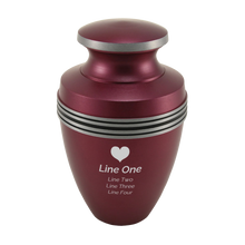 The Matte Magenta Aluminum Silver Accent Band Adult Cremation Urn offers a vibrant yet refined tribute, blending modern color with timeless craftsmanship. Made from durable aluminum, this urn features a matte magenta finish accented by polished silver bands for a sleek, contemporary appearance. It holds a 200 cubic inch capacity and secures tightly with a threaded lid for reliable protection. Optional silver engraving is available to personalize the urn with a name, dates, or message.