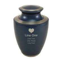 The Moonlight Blue Brass Adult Cremation Urn with Pewter Accents is a timeless expression of serenity and remembrance. Crafted from solid brass, it features a deep moonlight blue high-gloss metallic finish accented by pewter bands that highlight its elegant contours. This urn provides a 200 cubic inch capacity, ideal for adult ashes, and includes a secure threaded lid for safe closure. Personalization is available with pewter-colored engraving that harmonizes beautifully with its rich blue tone. Designed for grace and dignity, it serves as a meaningful tribute to a loved one’s lasting memory.