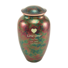 The Multicolor Raku Stainless Steel Adult Cremation Urn captures artistic beauty and timeless craftsmanship. Made from durable stainless steel, it features a stunning multicolor raku-inspired finish with iridescent shades of copper, green, blue, and violet that reflect light in mesmerizing ways. Designed with a 200 cubic inch capacity, this full-size urn safely holds adult ashes and includes a threaded lid for secure closure. Personalization is available with pewter-colored engraving, providing a subtle contrast against the vibrant finish.