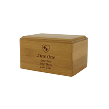Natural Bamboo Box Medium Pet Cremation Urn is made from sustainable solid bamboo with a warm natural finish. Designed for medium pets, it holds 40 cubic inches of ashes. The sliding panel at the bottom ensures secure closure, while personalization in dark brown engraving makes it a meaningful keepsake that honors your pet’s life.