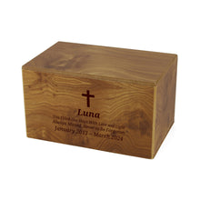 The Natural MDF Woodgrain Box Extra Large Pet Cremation Urn offers a warm and dignified way to honor the memory of a beloved companion. Crafted from durable MDF with a natural woodgrain finish, it blends seamlessly with home décor while providing long-lasting protection. With a 125 cubic inch capacity, this urn is suitable for pets weighing up to 125 lbs before cremation. A sliding bottom panel secured by a single screw ensures safe placement of ashes. Optional Dark Brown engraving adds a personalized touch with names, dates, or a meaningful message.