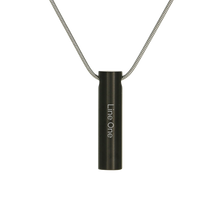 The Onyx Cylinder w/ Paws Pet Cremation Necklace, 19" Chain is crafted from durable stainless steel with a sleek onyx-black finish. Designed with engraved double paw prints, it serves as a heartfelt tribute to a beloved pet. Measuring 1.3" H × 0.3" W, the pendant discreetly holds a small portion of ashes, fur, or soil, keeping your companion close. A secure screw-top closure ensures contents remain protected, while optional engraving allows for added personalization. This pendant comes with a coordinating 19" chain and a filling kit for convenience.